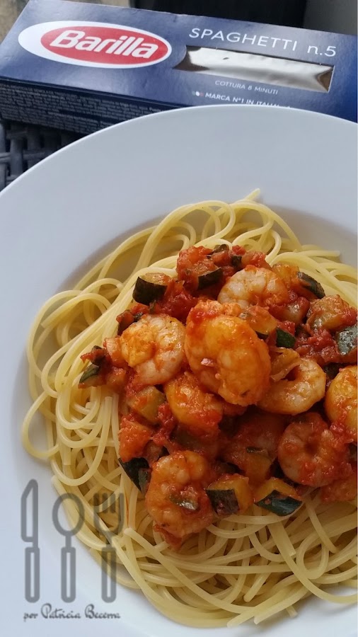 Cuando la pasta esté lista, la escurrimos y emplatamos poniendo una base de nuestra estupenda pasta y encima, generosa, la salsa con el calabacín y las gambas.
