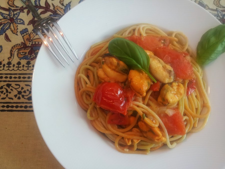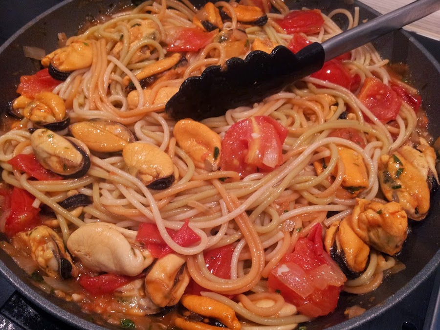 El buen tiempo arrecia y las recetas refrescantes empiezan a asomar en las mesas. Así que me uno a la causa y propongo una sencilla forma de preparar unos spaghetti (o la pasta que ande por vuestra despensa) con mejillones. Es un plato fresco, ligero y altamente sabroso. Una especie de salsa putanesca pero animada con moluscos. Silencio, se cocina...