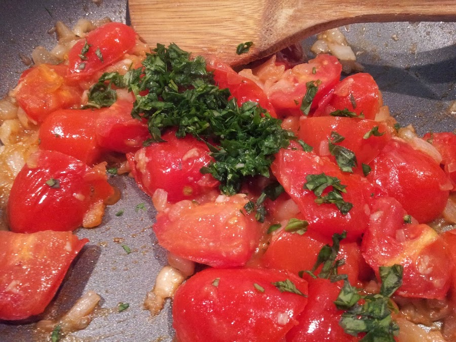 Añadimos los filetes de anchoas y removemos hasta que se disuelvan por completo en el sofrito. Lavamos y picamos muy finamente las hojas de albahaca. Las añadimos a la sartén y removemos de nuevo para integrar todos los aromas.