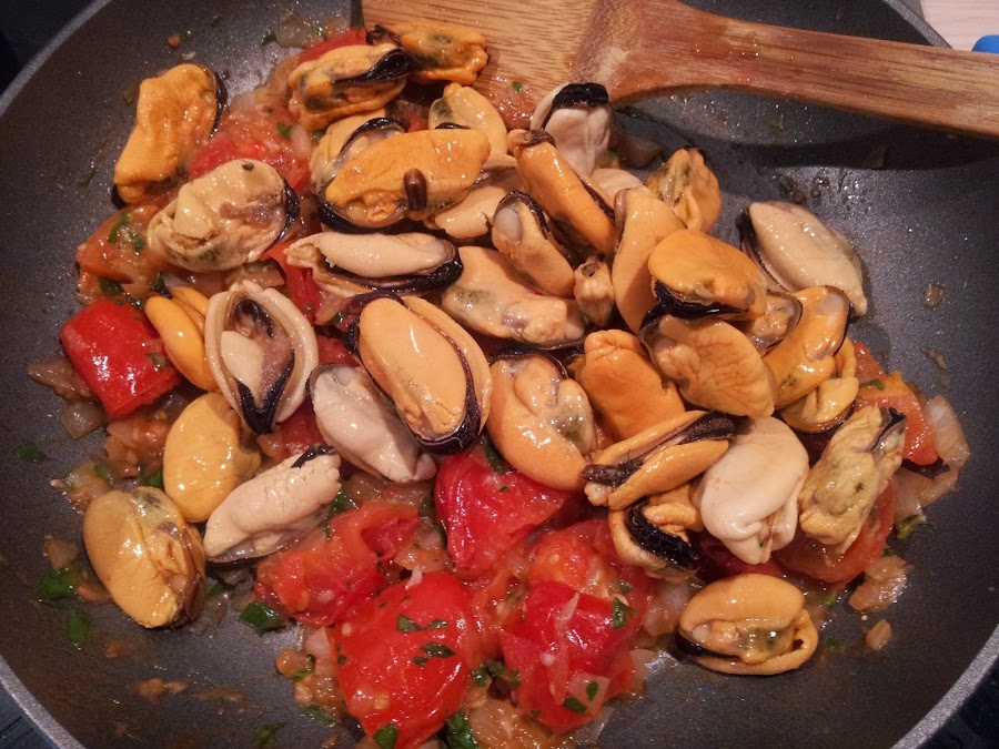 Cuando nuestro sofrito esté bien cocinado, es el momento de añadir los mejillones. Yo los tenía ya cocidos pero para cocerlos sólo hace falta limparles bien las "barbas" y cocerlos en un dedo de agua con la olla tapada y meneando continuamente unos 3 minutos.