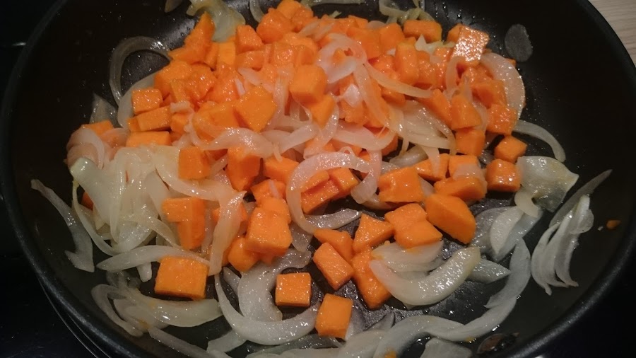 Cuando empiece a transparentarse añadimos la calabaza pelada y picada en pequeños dados. Removemos y tapamos la sartén. Vamos a dejar que se cocinen con su vapor hasta que la calabaza se ponga blanda y se deshaga fácilmente.