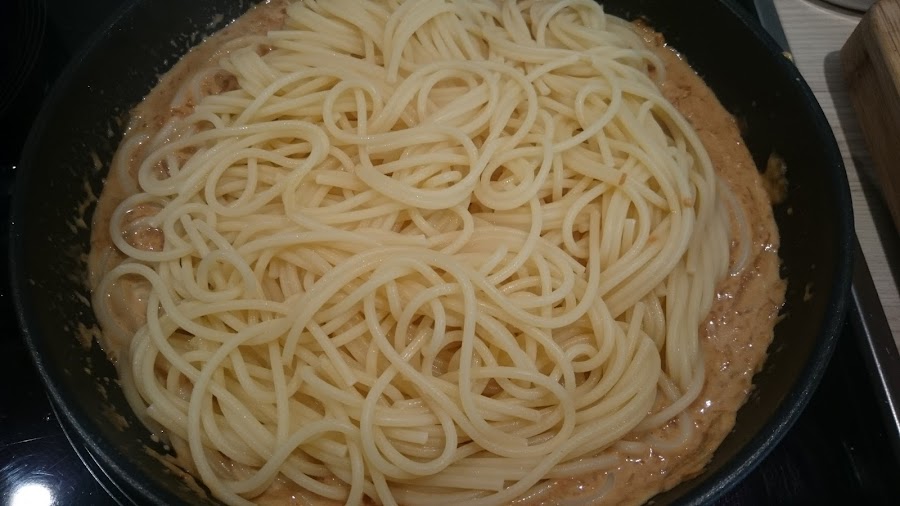 Rallamos queso Parmesano por encima (esto le dará "cuerpo" y sabor a la salsa) y añadimos los spaghetti ya cocidos. NOTA: Si vemos que necesita un poco de líquido para ligar bien la salsa, vertemos un cazo del agua de cocción de la pasta.