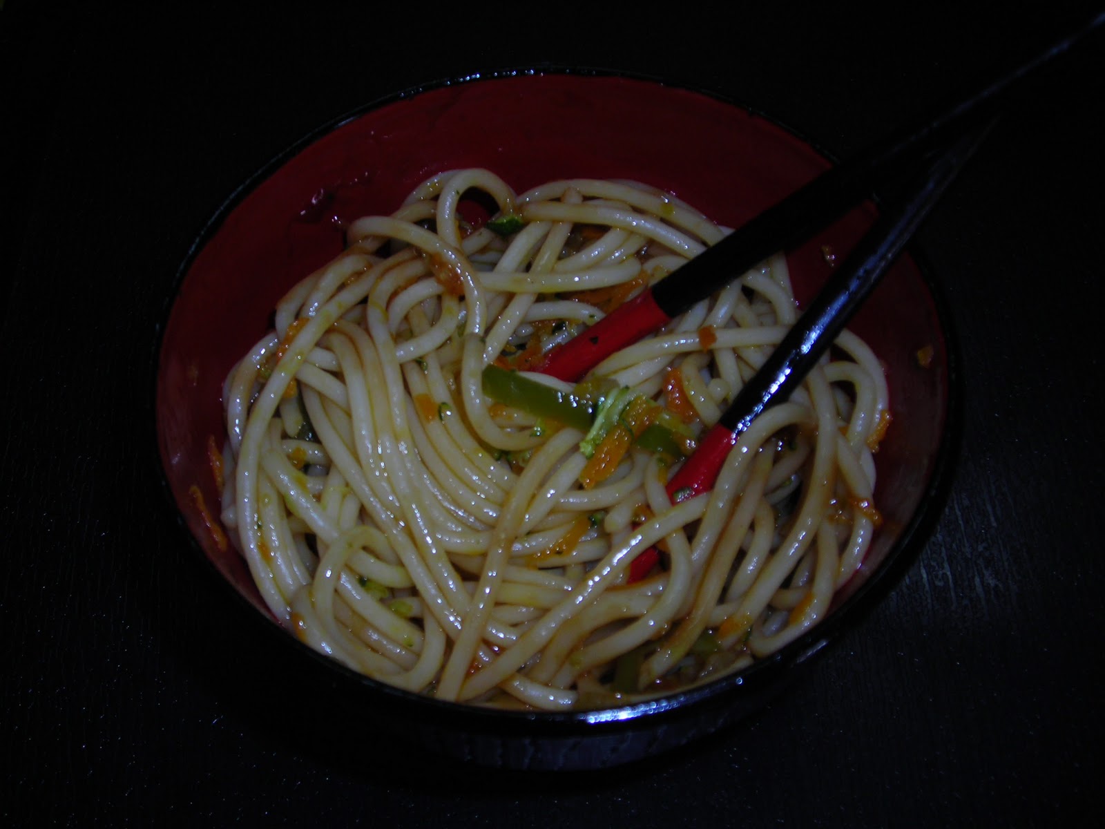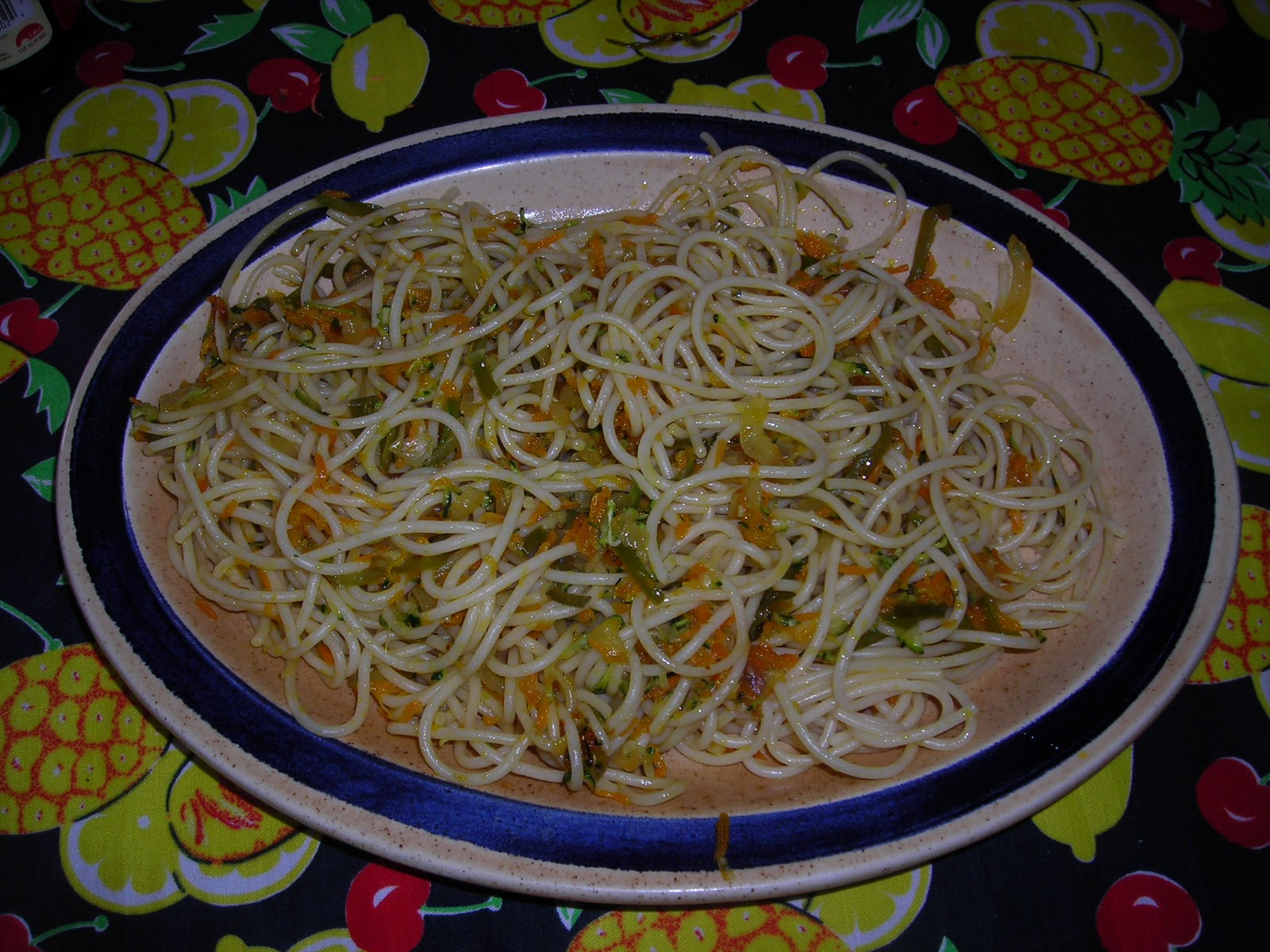 en una sarten con aceite , pochamos las verduras , añadimos los spaghetti escurridos y les damos unas vueltas para mezclar bien, ponemos unas cucharadas de salsa de ostras y movemos bien para que se reparta