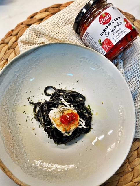Presentación de spaghetti nero di seppia con pimientos confitados