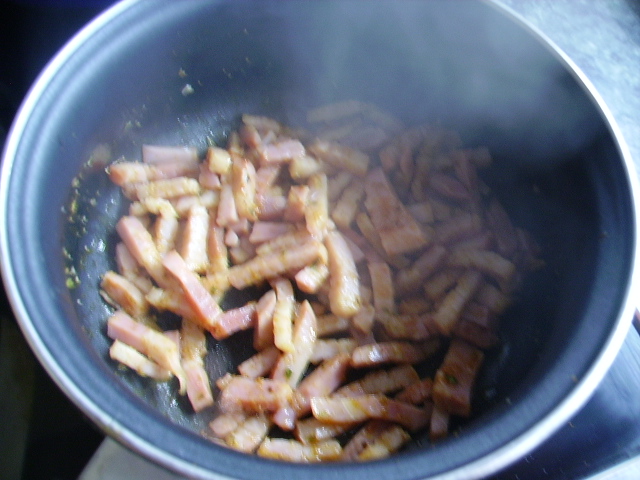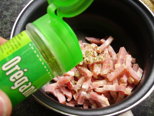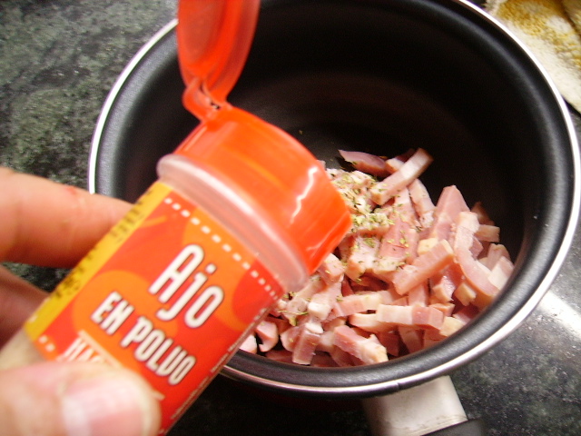 4.- Con un poco de aceite moreamos el bacon, con una pizca de orégano, ajo en polvo, la cayena y sal gorda.