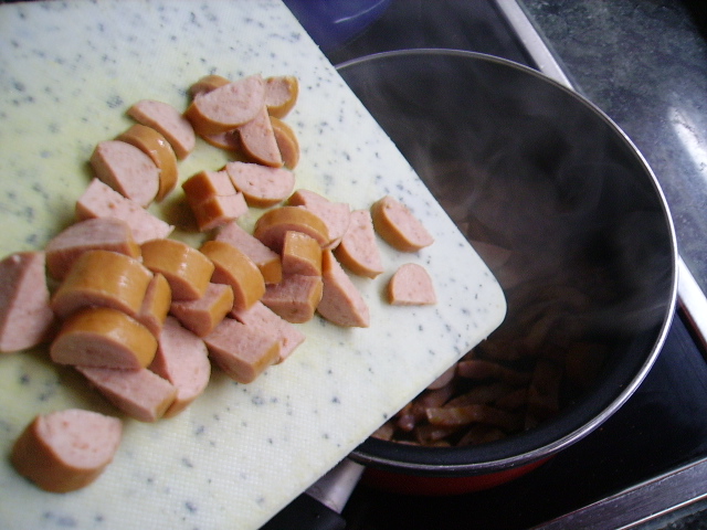 5.- Troceamos el hot dog y lo agregamos al bacon cuando esté hecho.