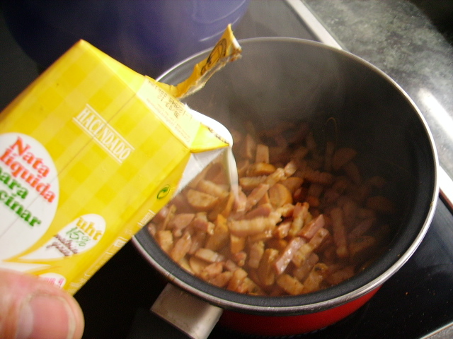 6.- Ahora sumamos la nata (crema de leche) y removemos para que coja sabor. Dejamos a fuego lento unos 3 minutos.