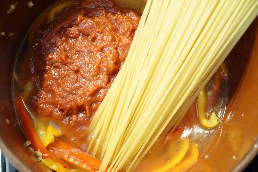 Esta receta es muy fácil de preparar, (como me gusta) es una de esas recetas tan populares hoy día. One pot pasta recipe. Pones todo en una cazuela, te preparas un café (o la bebida de preferencia) y te sientas a relajar mientras se cocina fuego lento.