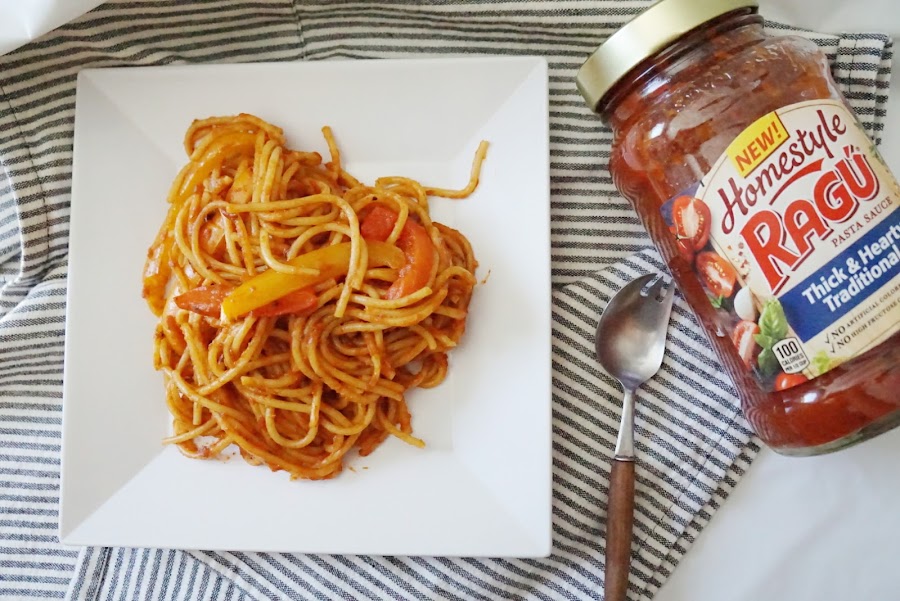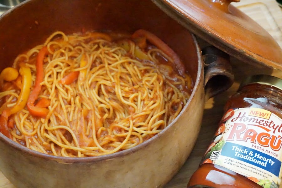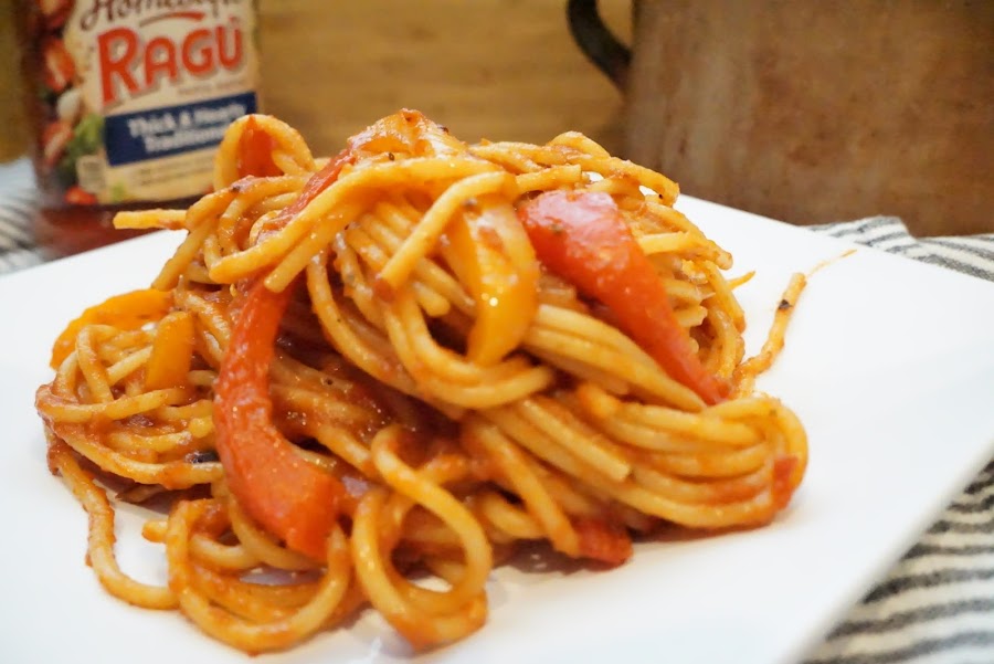 Spaghetti tradicional con chile morron con RAGÚ® Homestyle (estilo cacera)