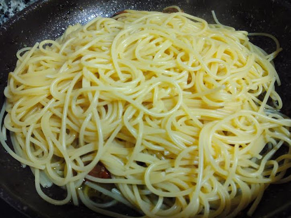 Cuando la pasta esté cocida, cogemos los espaguetis y los echamos a la sartén con los tomates y la albahaca. Vertemos un poco del agua de cocción y sofreímos todo junto unos minutos para que la pasta se impregne de los sabores y apartamos del fuego.