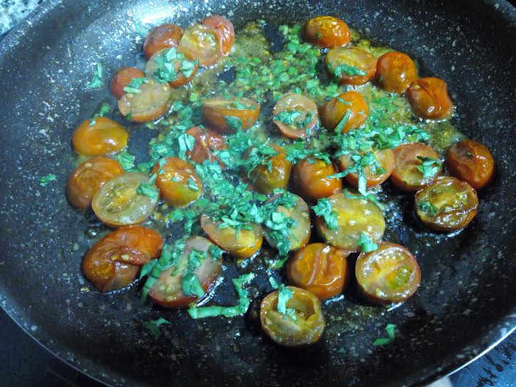 Los freímos a fuego lento para que suelten su juguito y cuando casi estén listos añadimos unas hojas de albahaca fresca bien picada.