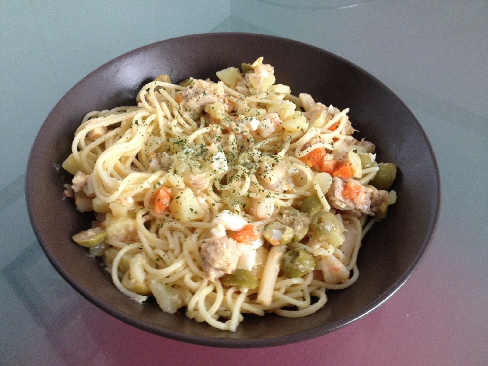 3º - Cocemos los spaghettis en una olla con agua hasta comprobar que queden al dente . Una vez cocidos , escurrimos el agua y los ponemos en un recipiente y metemos en la nevera hasta que enfríen .