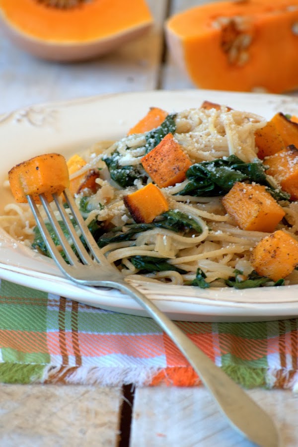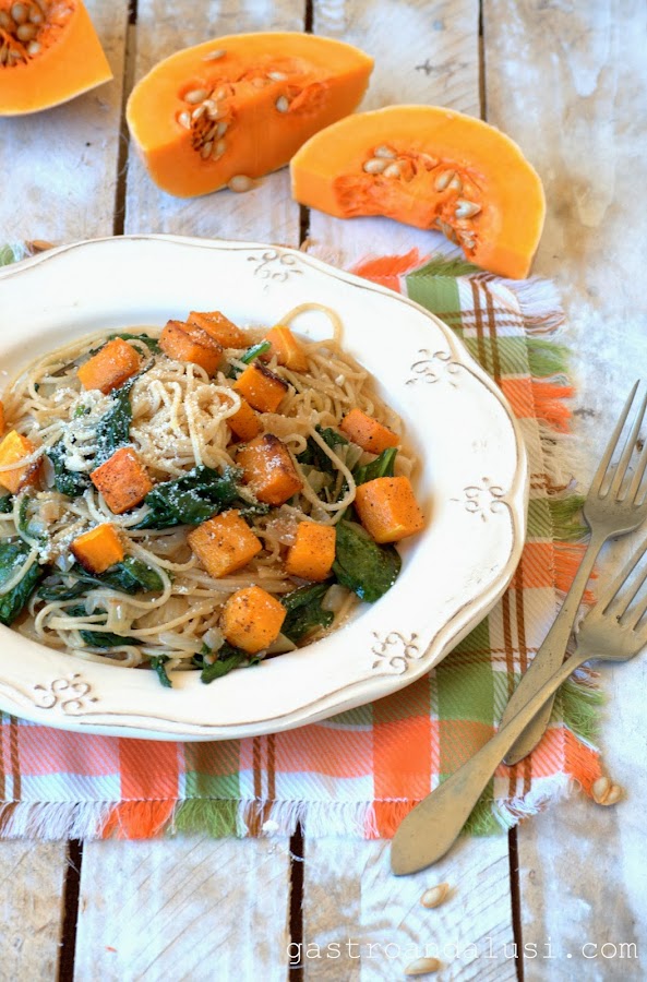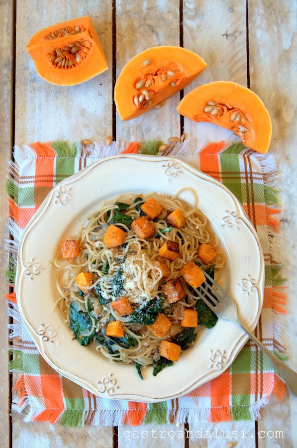 600gr de espaguetis integrales, media calabaza pelada y cortada en cubos, 25 gr de mantequilla, 3 ajos pequeños finamente picados, 1 cebolla grande o 2 pequeñas, 250 gr de espinacas frescas, Queso parmesano rallado, sal, pimienta y aceite de oliva virgen extra