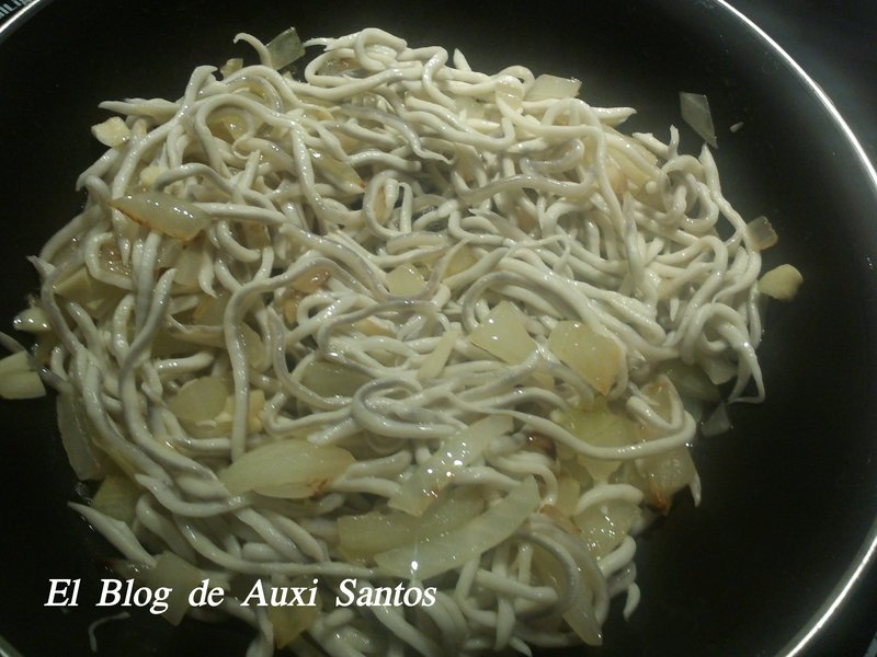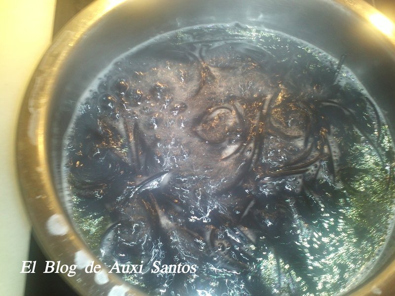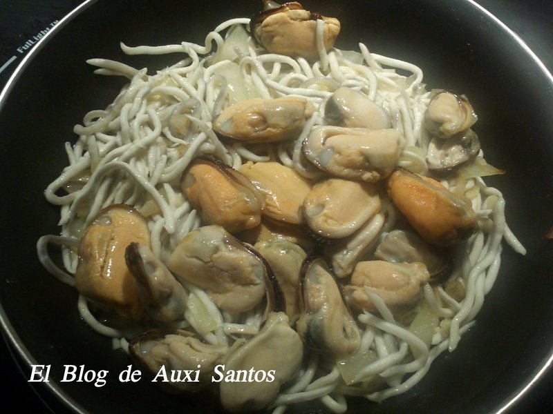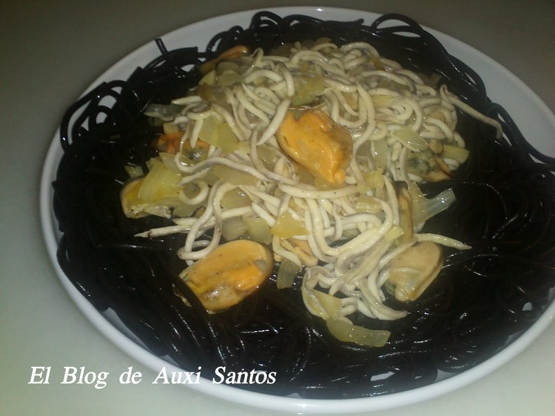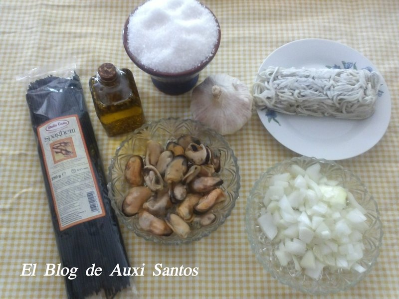 Spaghettis Negros,mejillones cocidos,anguliñas,ajo,cebolla,aceite y sal