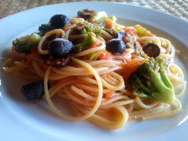 Añadir el brócoli CRUDO se le habrá lavado troceado y pelado los tallitos de las flores para que estén mas tiernos, también se pueden aprovechar los troncos más grueso pelados y troceados. Añadir al tomate cocinado y dejar que se vaya haciendo entre unos cinco y diez minutos depende de la calidad del brócoli. La idea es que queden crocantes no blandos. Añadir la sal al gusto. Añadir las aceitunas cortadas en láminas o por la mitad y dejar alguna entera para decorar el plato.
