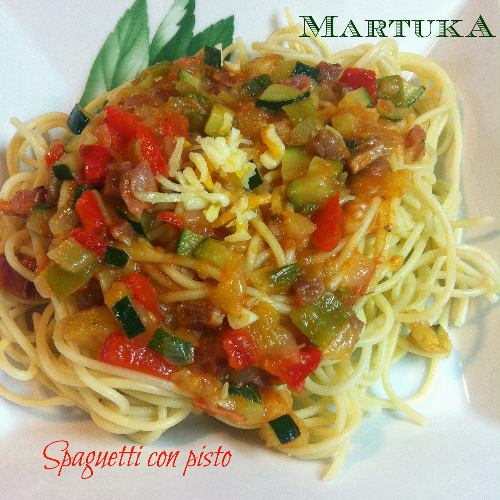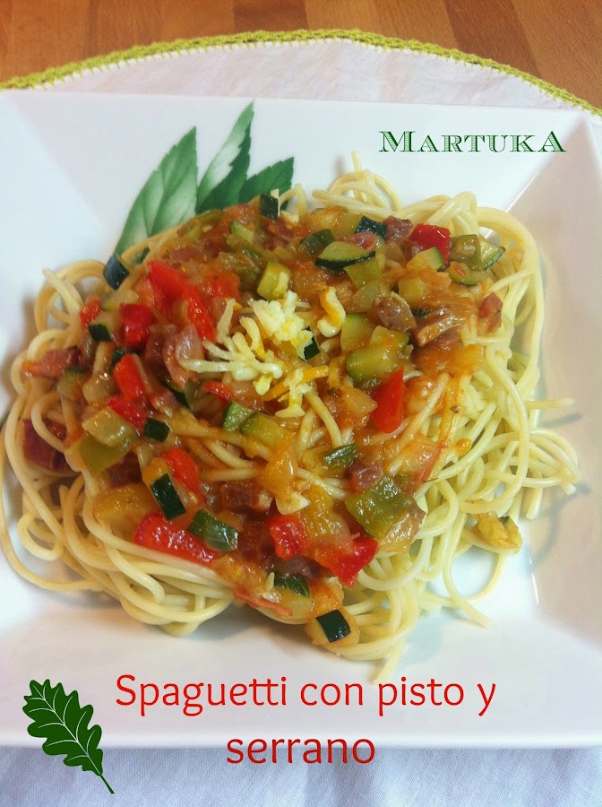 Para contentar a todos en casa he mezclado las hortalizas del pisto con los siempre deliciosos spaguetti y el puntito del jamón serrano para introducir proteínas. Así se consigue un primer plato (para mi es un plato único) sanito y nutritivo. El resultado: genial