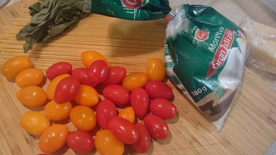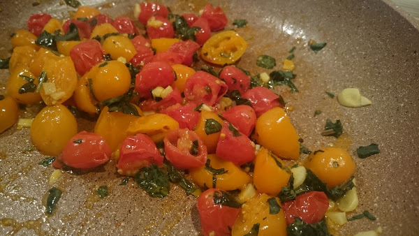 Cortamos por la mitad los tomateros cherry y los añadimos a la sartén. Salteamos unos minutos a fuego vivo. Luego añadimos un poco de agua para ayudarles a que se cocinen perfectamente. (NOTA: El agua puede ser de la propia cocción de la pasta)