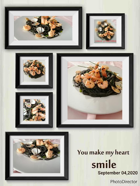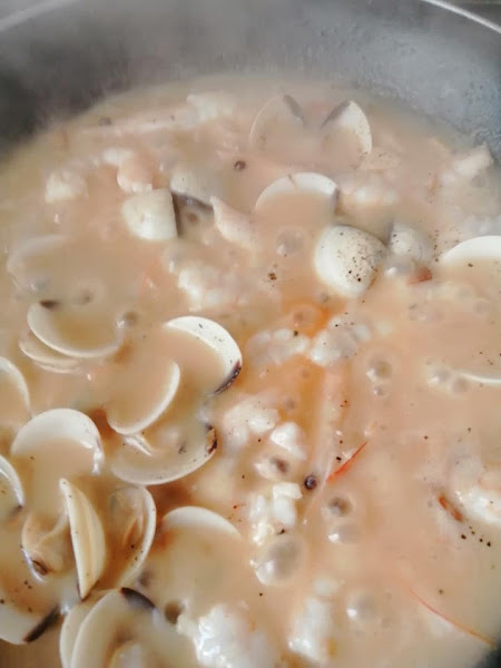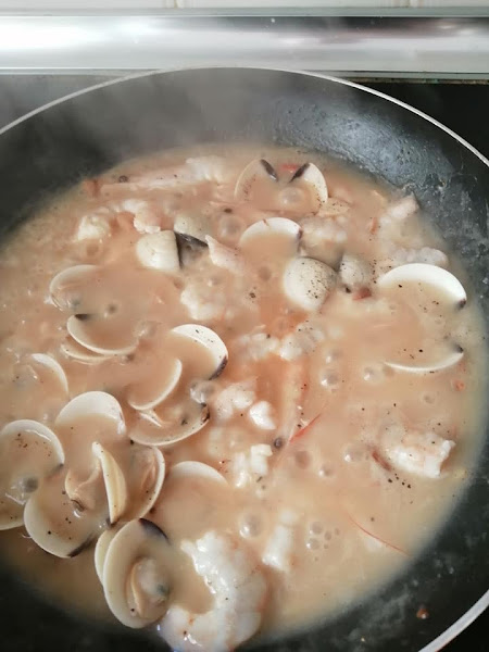 Volcar las almejas y a los pocos minutos, añadir los langostinos crudos pelados.