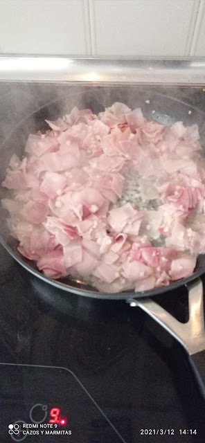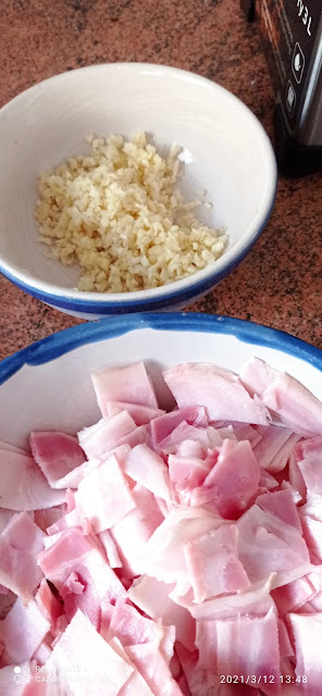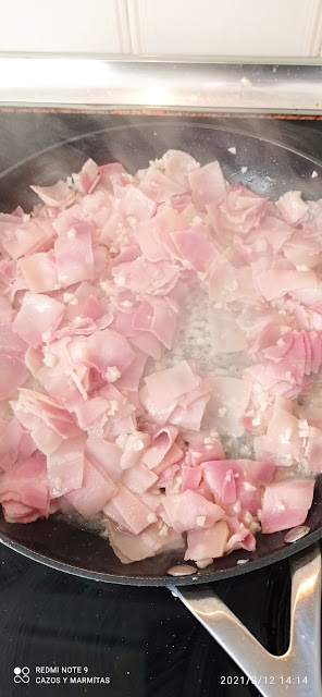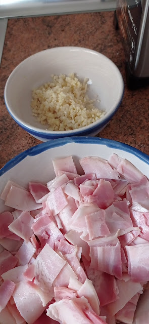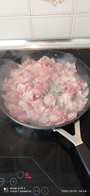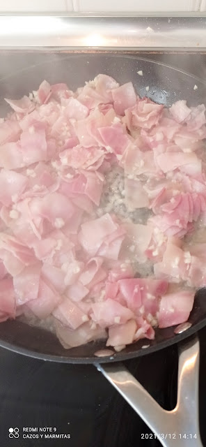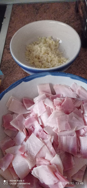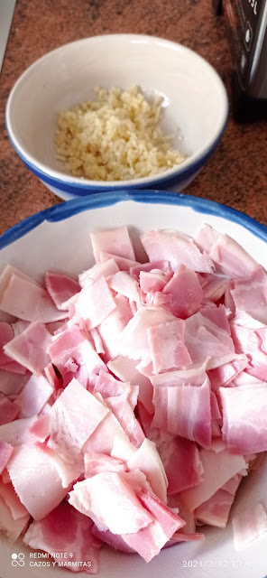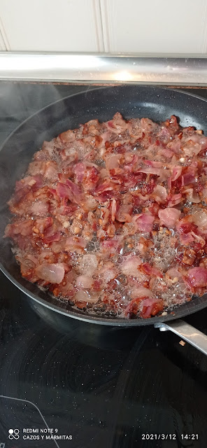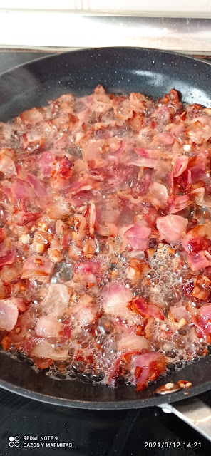 En una sartén con aceite, añadir el bacon y el ajo a fuego fuerte hasta que el bacon quede crujiente sin llegar a quemarse.