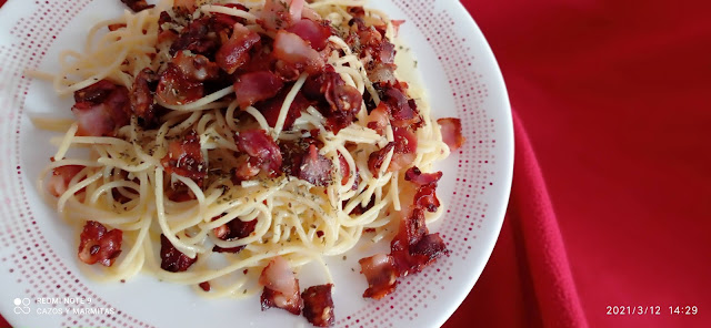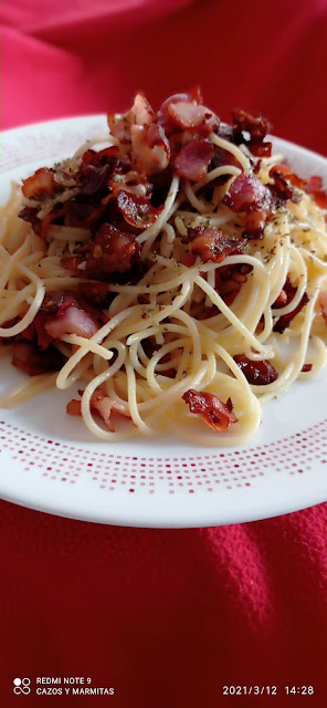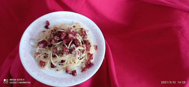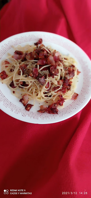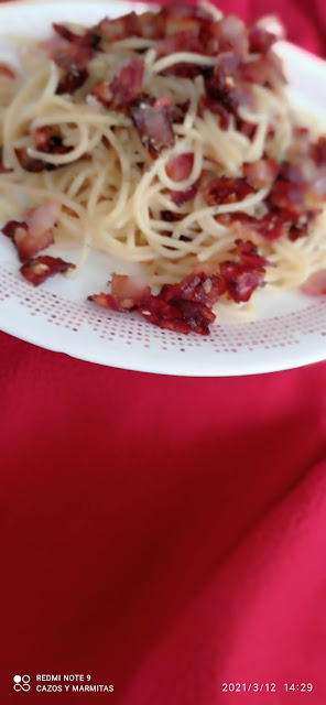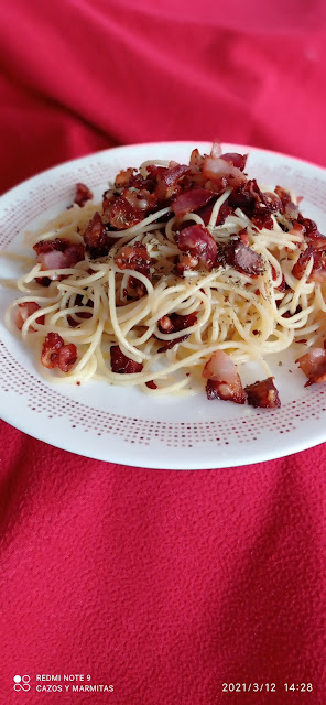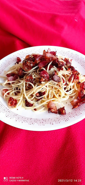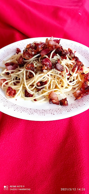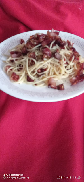 Volcar sobre el spaguetti y remover para que el spaguetti se impregne del sabor del bacon y del aceite.