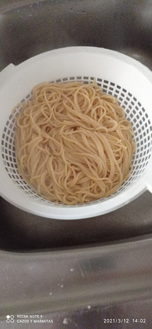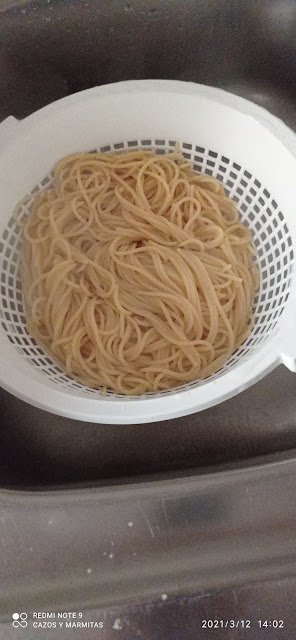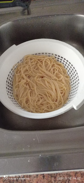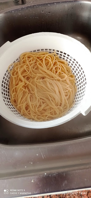 Despues de cocer el spaguetti, volcar en un colador y escurrir sin refrescar con agua fría.