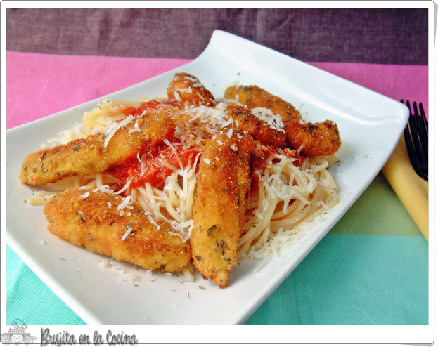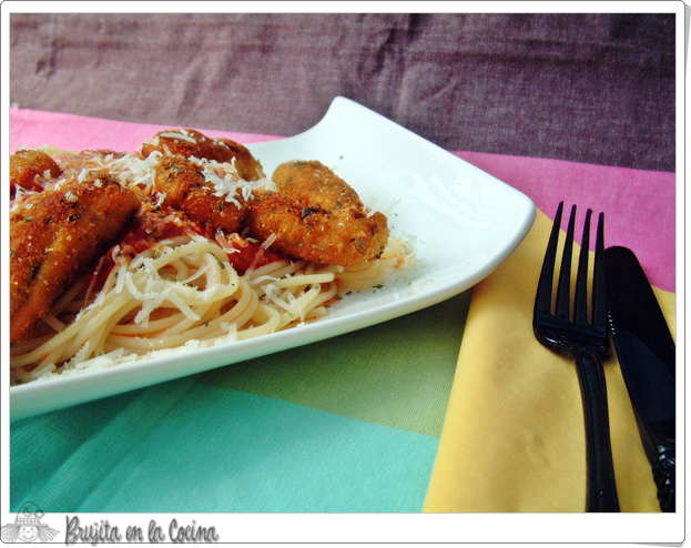 Pasado el tiempo colamos para quitar el agua y montamos el plato, con los spaguettis, encima salsa de tomate casera y coronando con con unos fingers y queso recién rallado.