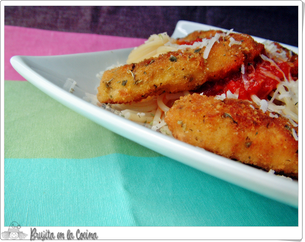 Bueno pues como quiero empezar bien la semana traigo un rico plato de pasta. Porque me encanta la pasta, sigo siendo en ese sentido una chiguita. Y la acompaño con crujientes filetes de pollo y tomate. Un plato que bien puede ser para los peques de la casa que seguro van a disfrutar y los no tan peques. Os animo a preparlo porque no lleva mucho tiempo y como está tan rico se te olvida la hora que es.
