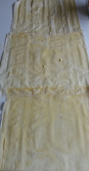 Extendemos las láminas de filo todo lo largo que podamos. Pintamos con mantequilla fundida una primera capa y sobre ésta añadimos otra. Volvemos a pintar con mantequilla fundida.