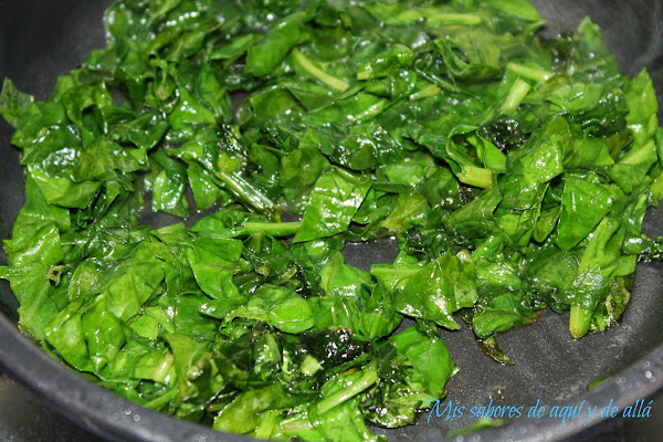 En primer lugar, cortamos las espinacas en tiras y las rehogamos en una sartén, tampoco tienen que hacerse mucho, ya que todo va al horno un rato. Yo simplemente dejo que cambien un poco de color.