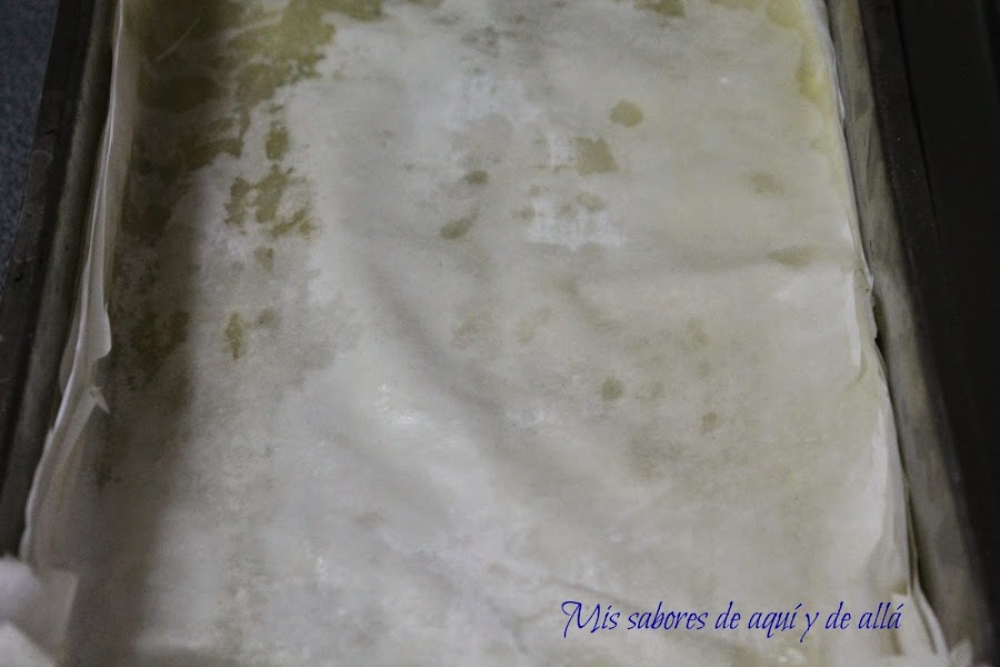 Por otro lado, según el tamaño del molde, cortamos las hojas de masa filo y pintamos con aceite o con mantequilla derretida. (Los puristas dirían que se hace con mantequilla pero el resultado con aceite de oliva es bastante satisfactorio y es más sano).