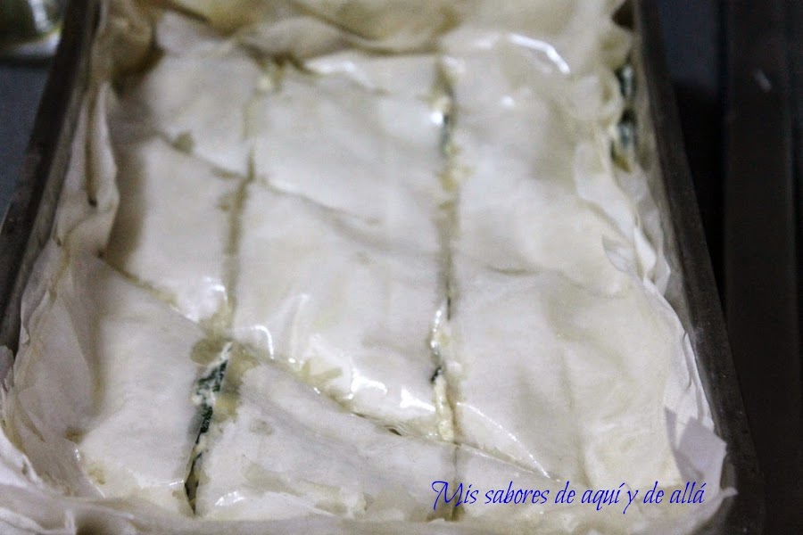 We turn on the oven to 210 ° C and paint the remaining phyllo sheets with oil to the top. Once we have all put them on top of the spinach mixture.