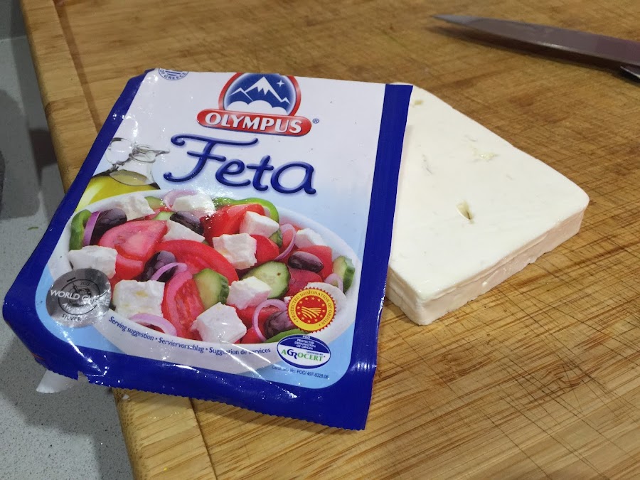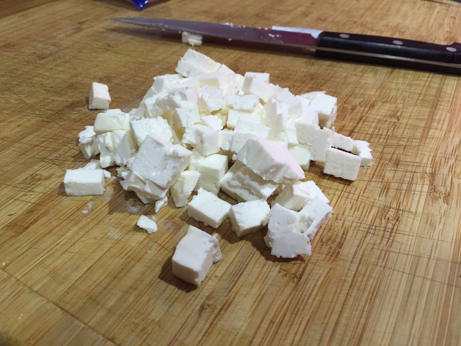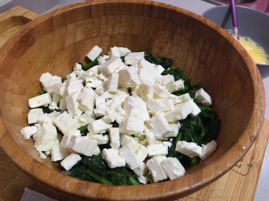4. Cortamos la tableta de queso feta en trocitos pequeños y lo añadimos a las espinacas una vez éstas hayan templado. Mezclamos bien.