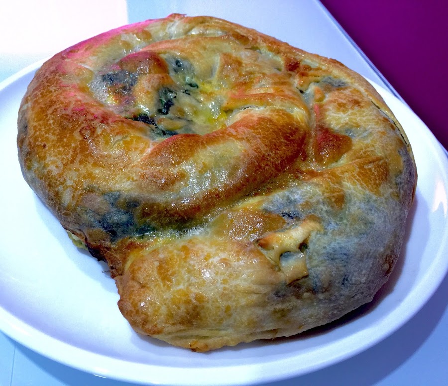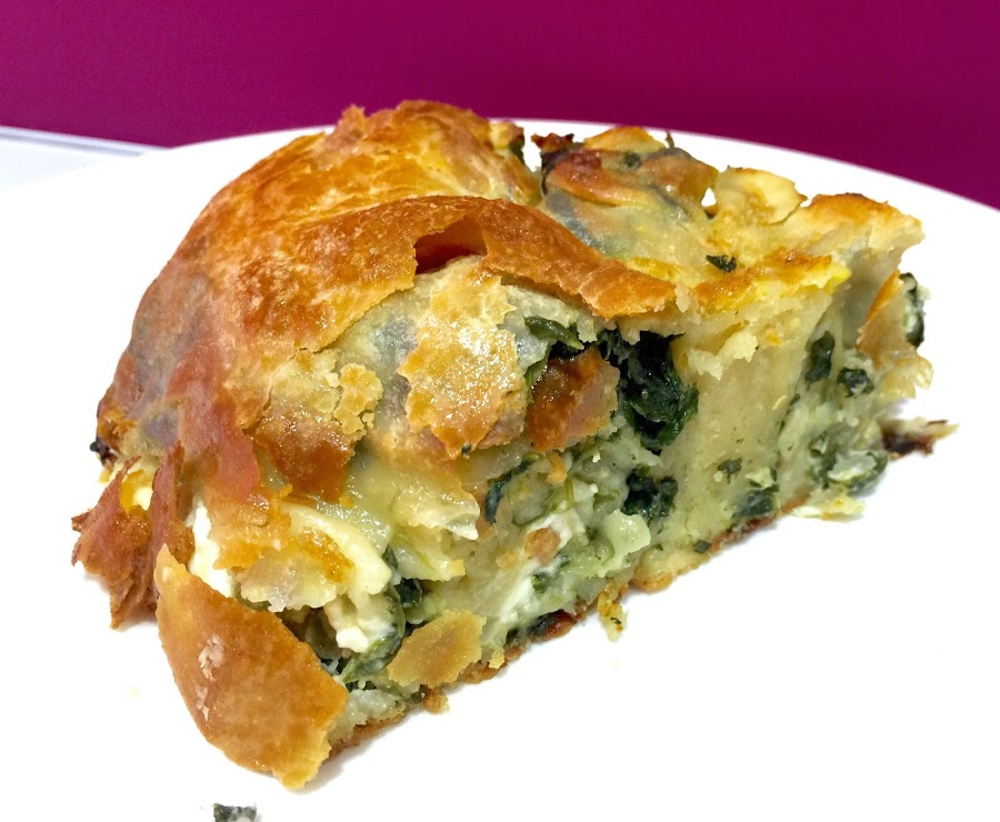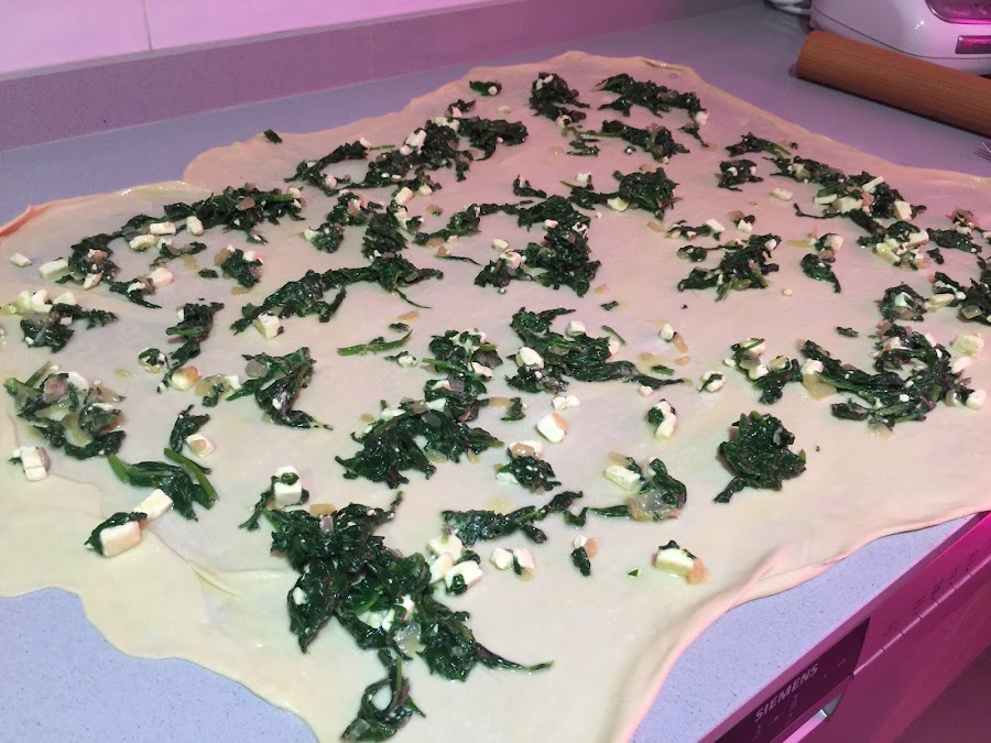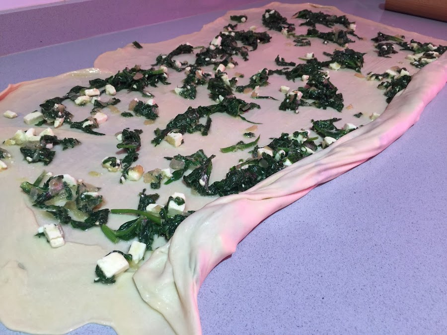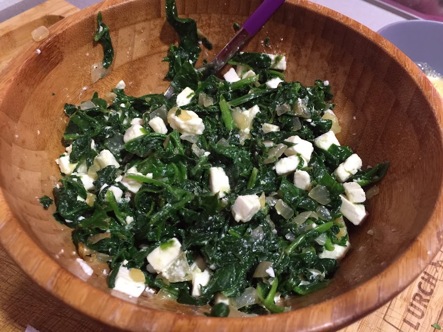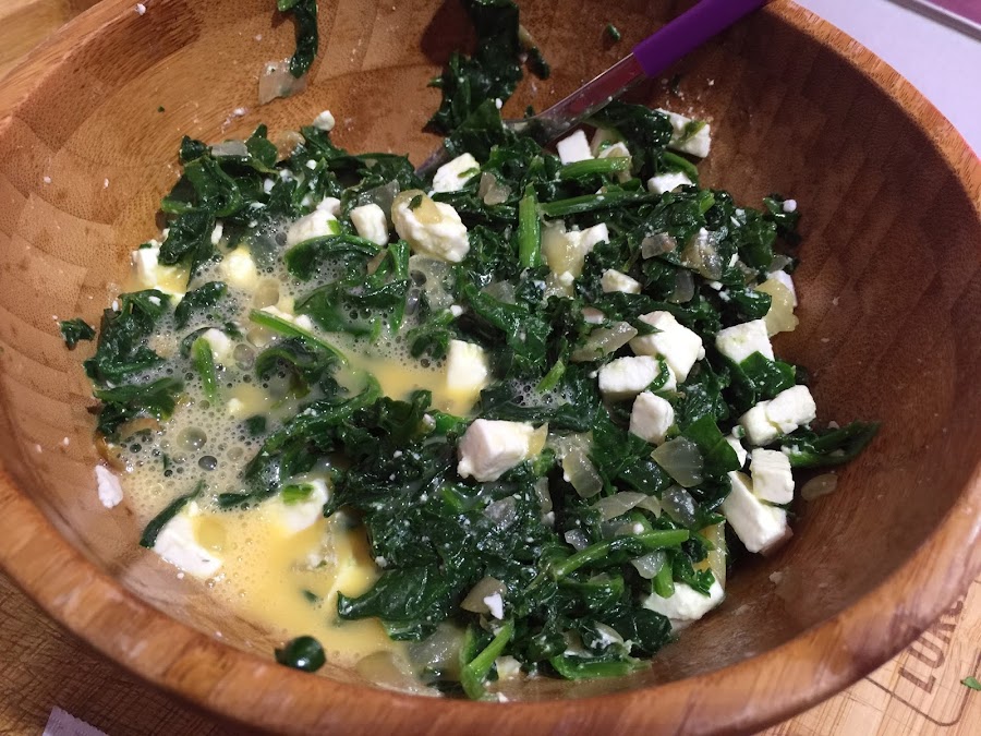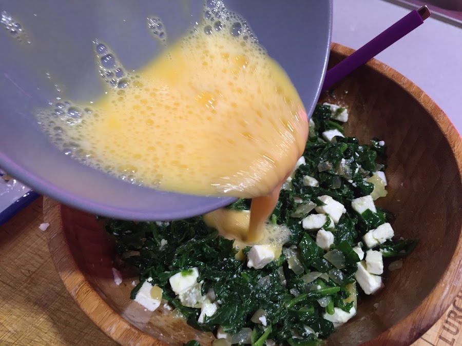 5. Batimos un huevo y lo añadimos a las espinacas y al queso feta, reservamos un poquito de huevo batido para pincelar al final. Ahora ya tenemos nuestro relleno listo. Lo reservamos en la nevera hasta el momento de rellenar.