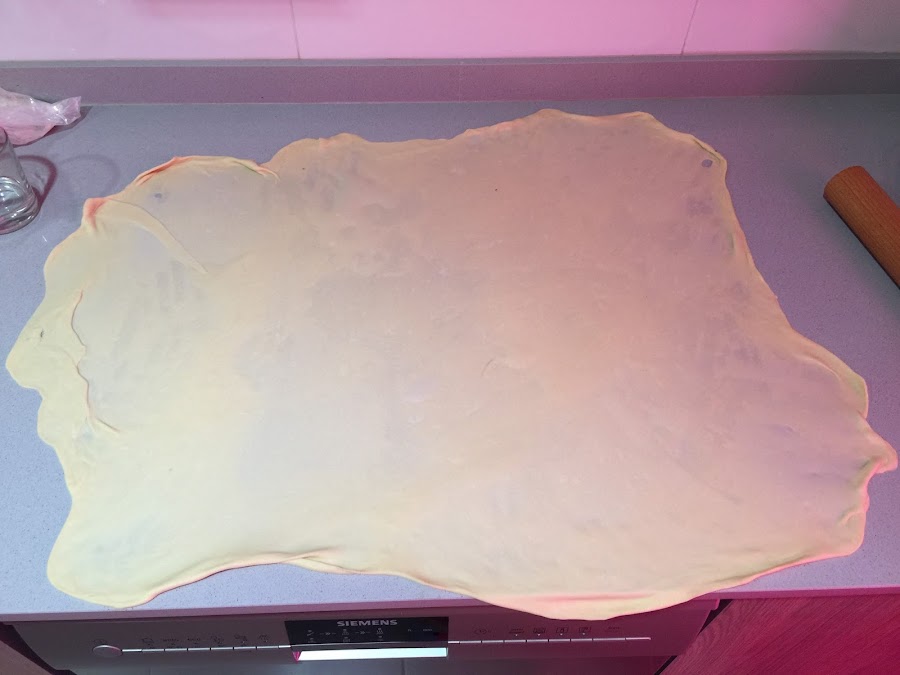6. Precalentamos el horno a 200ºC. Cuando la masa ya haya reposado el tiempo suficiente, la ponemos sobre una superficie lisa y limpia. Con un rodillo empezamos a estirarla. Es increíble lo que esta masa da de si sin romperse. Hay que estirar y estirar hasta que la masa prácticamente sea transparente.