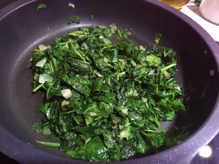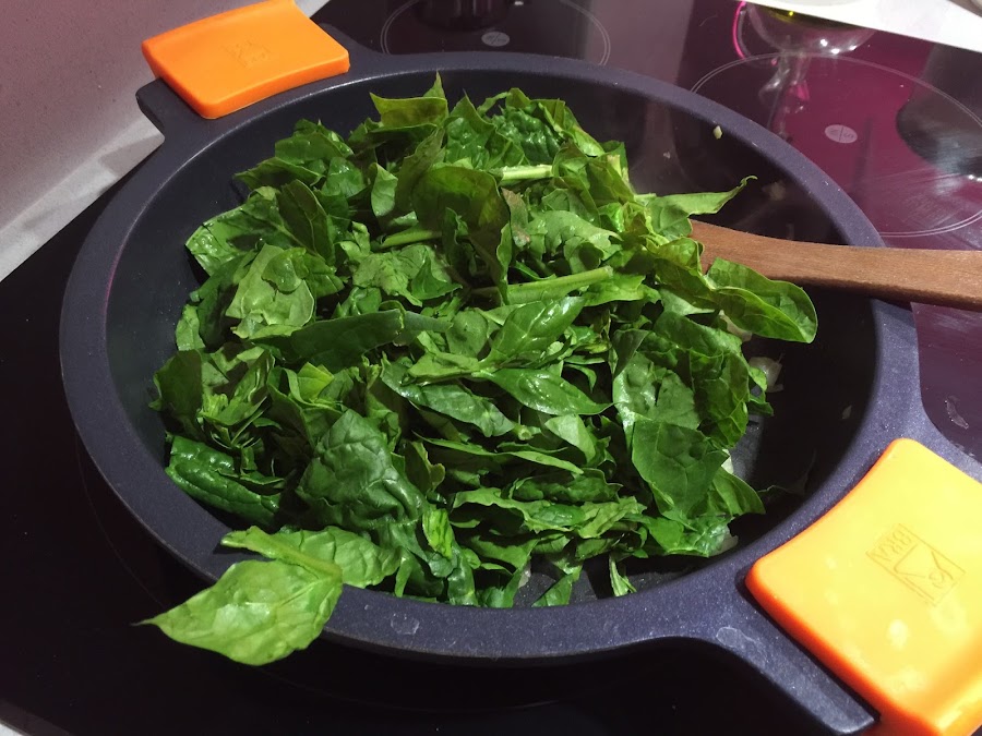 3. Cuando la cebolla esté en su punto añadimos las espinacas frescas. Yo uso espinacas de bolsa, que ya vienen lavadas. Antes de ponerlas en la cazuela cortarlas un poquito con el cuchillo para que el relleno quede mejor. Cuando la espinaca haya menguado las dejaremos enfriar a temperatura ambiente.