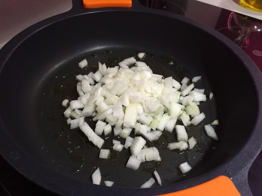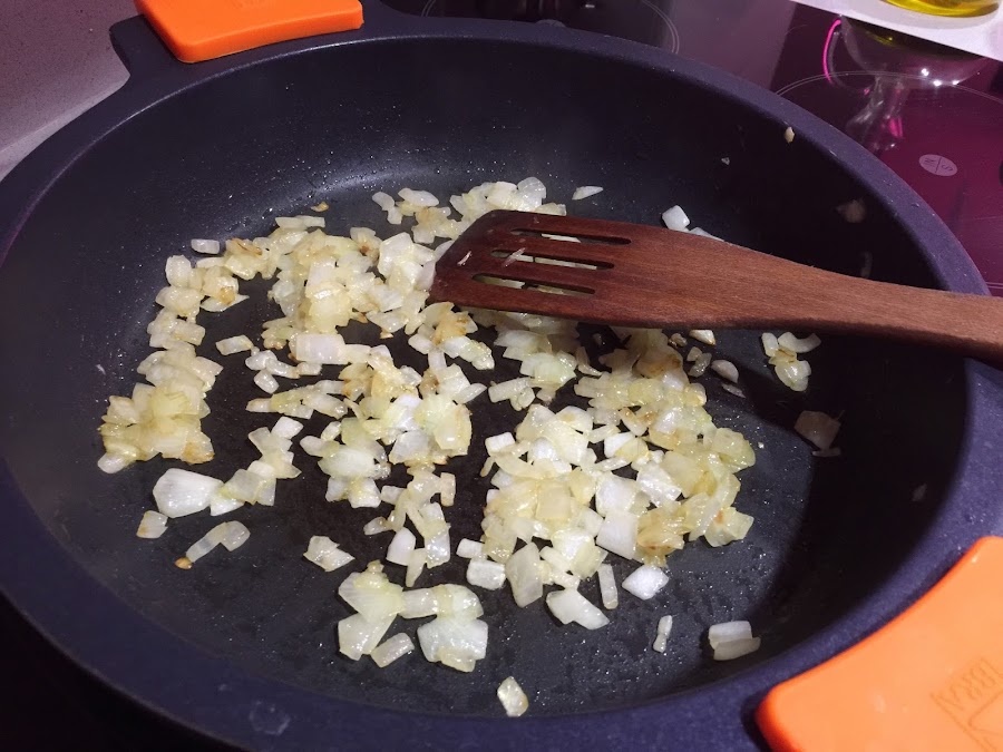 2. Mientras la masa reposa preparamos el relleno de nuestra spanakopita. Ponemos un poco de aceite de oliva virgen extra en la cazuela y sofreímos la cebolla a fuego medio durante 10-12 minutos. Hasta que tenga un tono dorado y transparente.