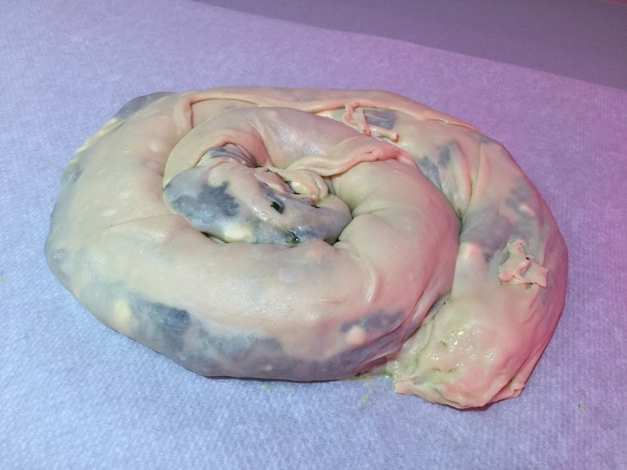 8. Repartimos el relleno por toda la superficie de la masa. Con paciencia y buena letra empezamos a enrollar la masa, ejerciendo la máxima presión posible sobre la masa, que quede bien prieto. Si no conseguimos apretarlo bien quedaría hueco por dentro al hacerse. En cambio si lo ceñimos bien, lograremos un interior bien relleno.