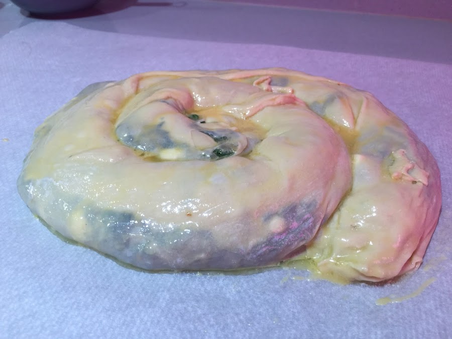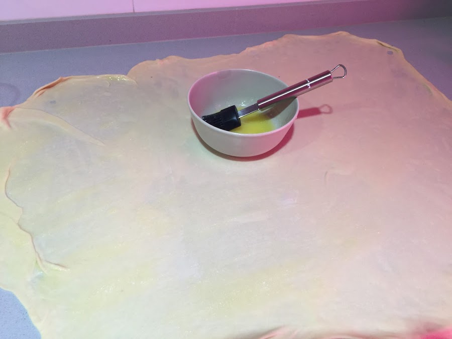 9. Podemos darle la forma que nos apetezca, yo en esta ocasión le he dado forma de espiral. Ponemos sobre papel de horno y pincelamos toda la superficie con mantequilla. Pincelamos también el huevo batido que hemos reservado antes.
