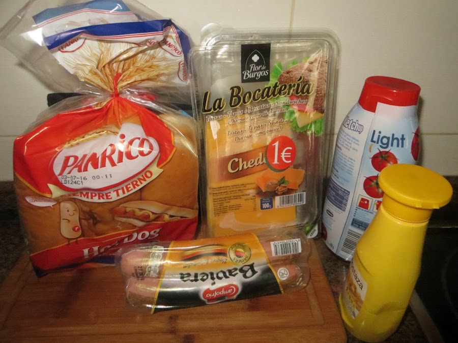 Elaboración:Calentamos el pan abierto en la plancha junto con las salchichas. Una vez que están listos los dos productos esenciales del perrito, enrollamos a los lados dos lonchas de chorizo, en este caso he utilizado pamplonica porque es el más rojo y quedaba mejor para hacer la bandera de España. Y en el centro enrollamos media loncha de queso cheddar y ya tenemos nuestro perrito con los colores de nuestra bandera, lo acompañamos con kétchup y mostaza y listo para comer.