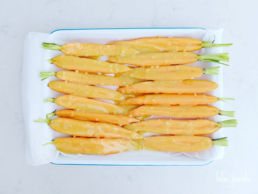 Lavamos y secamos bien las zanahorias. Las cortamos longitudinalmente por la mitad dejando un trocito del tallo verde para que quede más rústico. Las colocamos en una bandeja de horno donde previamente hemos puesto una hoja de papel de hornear.