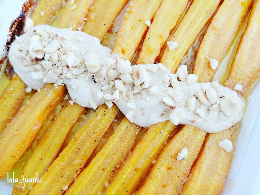 Como la bandeja donde las hemos horneado me encanta, las servimos en ella. Colocamos un poco de salsa tahina en el centro y espolvoreamos las avellanas.