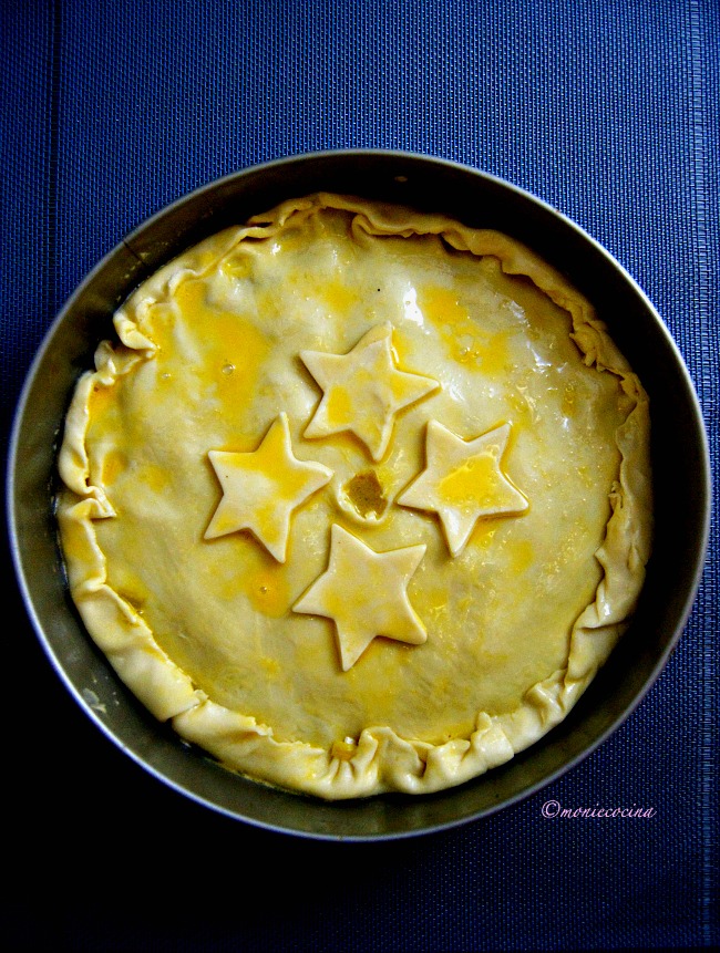 Rellenamos, colocamos la otra lámina de masa que hará de tapa del pastel. Le hacemos los adornos que queramos pero siempre con un agujero en el centro para que respire, pintamos con huevos batido y horneamos a 180 grados unos 25 minutos cuando veamos que el pastel está crujiente.
