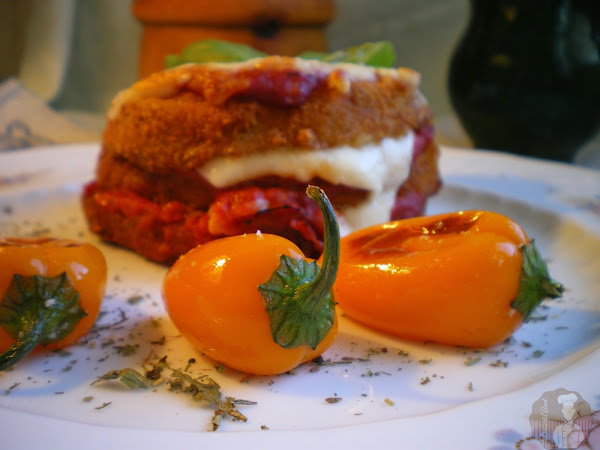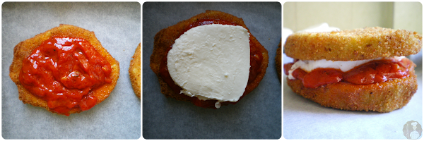 Sobre una rodaja de berenjena rebozada, añadir 1 cucharada de salsa marinara y encima colocar una lámina de mozzarella, tapar con otra rodaja de berenjena. Repetir este montaje dos veces más, terminando de manera que la mozzarella quede en la parte superior.