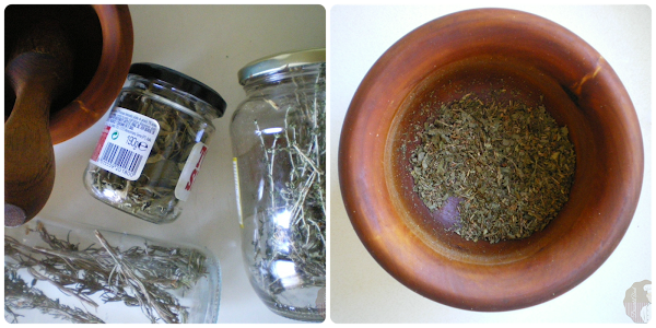 Mezcla todos los ingredientes en un mortero. Una vez utilizada la cantidad necesaria se almacena el sobrante en un recipiente hermético y se guarda en un lugar fresco y seco, de esta manera podemos usarlo en cualquier otra ocasión en perfectas condiciones.
