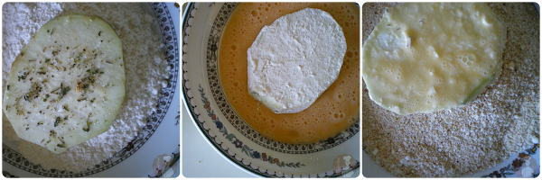 Para el rebozado seguir este orden: primero pasar las rodajas de berenjena por la harina, en segundo lugar por el huevo batido y por último, por la mezcla de pan rallado y parmesano, presionando para que queden bien impregnadas por ambas caras. Según se vayan rebozando, pasarlas de nuevo a la placa donde las hemos tenido anteriormente reposando.