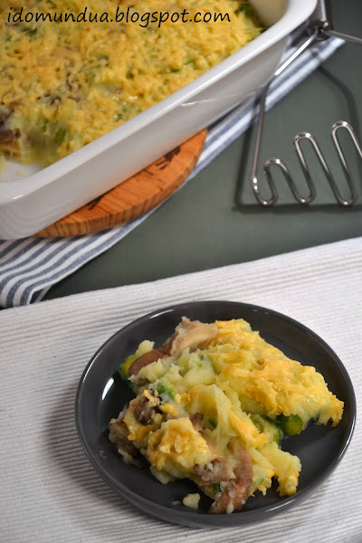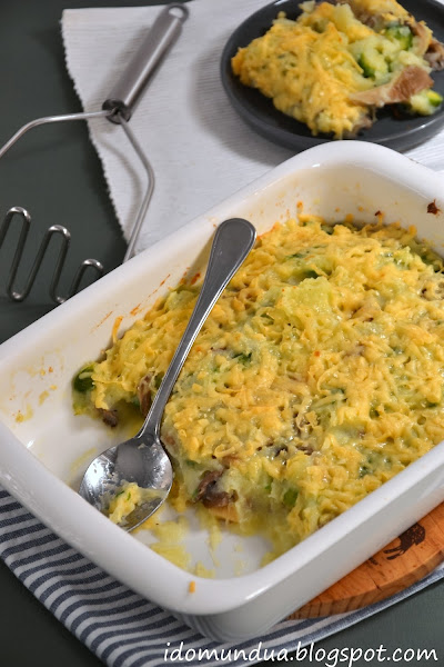 - Ahora ponemos nuestro puré de patata en una fuente para horno, lo cubrimos con queso y lo metemos al horno precalentado: 10 minutos a 200ºC con calor por arriba y 5 minutos con el gratinador.