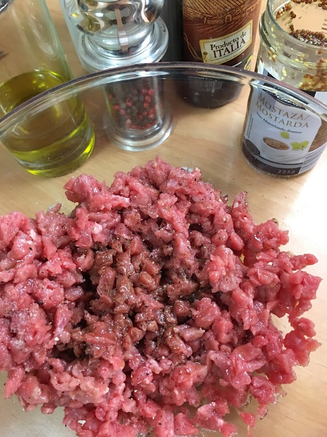Se coloca la carne picada a cuchillo en un bol, se añade el aceite, una pizca de Tabasco, el vinagre, la sal y la pimienta. Se remueve.