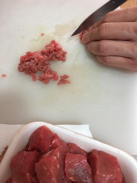 Lo primero que se hace es cortar la carne con un cuchillo bien afilado en tacos muy pequeños.