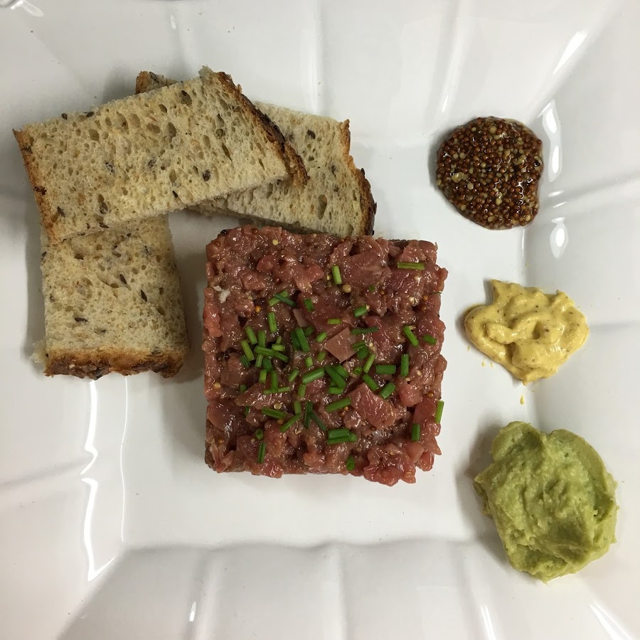 Se rectifica de sal y pimienta y se sirve emplatado en un aro, con cebollino espolvoreado por encima y con pan tostado para acompañar, untado el steak como tostas.