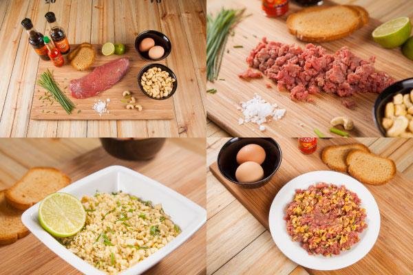 Mezcla en un bol el cebollino picado, los anacardos troceados, la salsa Worcestershire, el tabasco, la salsa de soja y el zumo de lima.